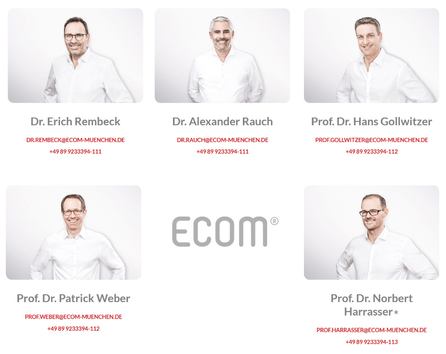 Herzlich willkommen bei ECOM® Excellent Center of Medicine, Ihrem Kompetenzzentrum für Orthopädie, Sportmedizin und Unfallchirurgie in München. Wir sind Ihr Ansprechpartner für ärztliche, diagnostische und therapeutische Leistungen insbesondere bei Beschwerden des Bewegungsapparates. Im diskreten Ambiente einer Privatpraxis werden Sie unter der Leitung von Dr. Erich Rembeck, Dr. Alexander Rauch, Prof. Dr. Hans Gollwitzer, Prof. Dr. Patrick Weber und Prof. Dr. Norbert Harrasser mit umfangreicher Expertise nach modernsten medizinischen Standards behandelt.