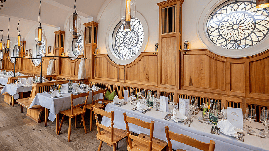 Wer es urig-gemütlich mag, findet in den Seitenflügeln oder im Hacker-Stüberl umgeben von Tonnengewölben seinen Platz. Tische und Bänke aus Ahorn- und Birnenholz, Böden aus Naturstein und Eichenholz sowie warmes, gemütliches Licht schaffen eine einladende Atmosphäre, in der das Essen perfekt zur Geltung kommt.