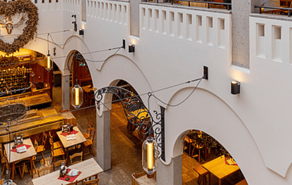 Das zweitälteste Wirtshaus Münchens wurde 2015 umfassend renoviert und beeindruckt seither mit seiner besonderen Architektur. Mittelpunkt ist die große Holzfassschänke aus Kupfer im Innenhof. Bei gutem Wetter öffnet sich das gläserne Cabrio-Dach vollständig – so kann man im Sommer unter freiem Himmel speisen. Die Atmosphäre ist entsprechend hell und freundlich.